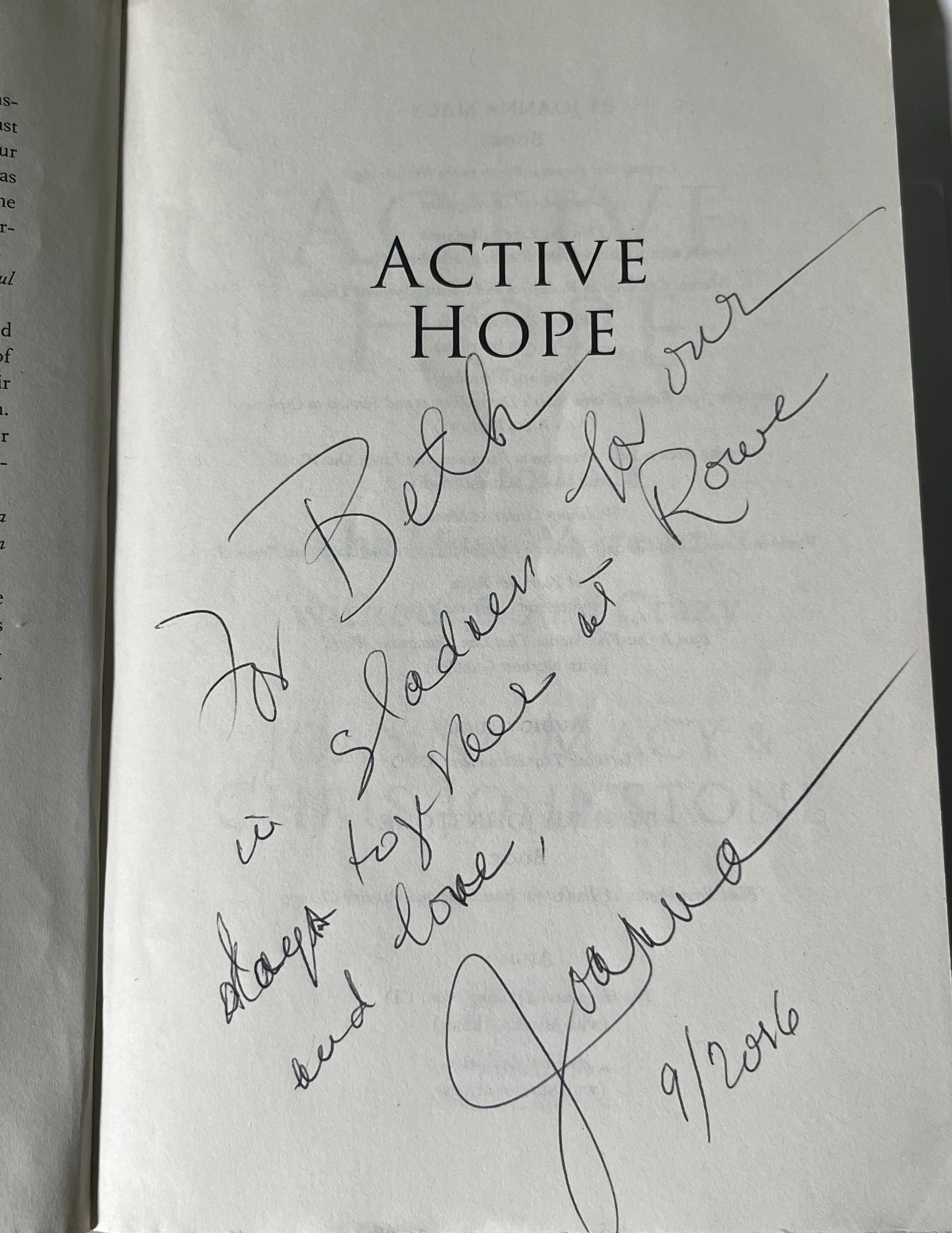 I have a well-loved, dog-earred, heavily underlined copy of Coming Back to Life (the comprehensive guidebook for the Work That Reconnects that she co-authored with Molly Brown) so when I met her in 2016 at a three-day workshop she was leading at the Rowe Center in Massachusetts, I knew that I would be in the presence of a wise teacher. Upon meeting her, I also experienced her incredible combination of intellect, compassion, and groundedness. In Coming Back to Life, she wrote, “ So, as a guide, assume a natural authority without altering your manner. Don’t get precious about it. Don’t assume a special tone of voice or pious measured speech; that just puts people off.” That is exactly who she was and how she led the workshop. She was so real, present, and open-hearted to both the beauty and suffering in the room and in our world.