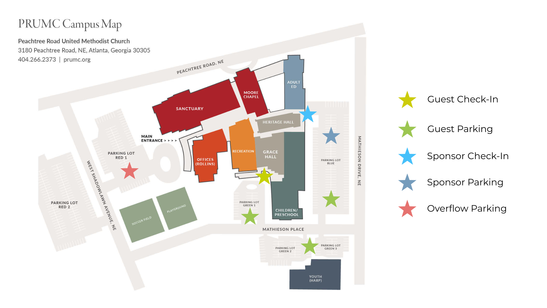 The church is a 15-minute walk down Peachtree Road from the Buckhead MARTA Station.